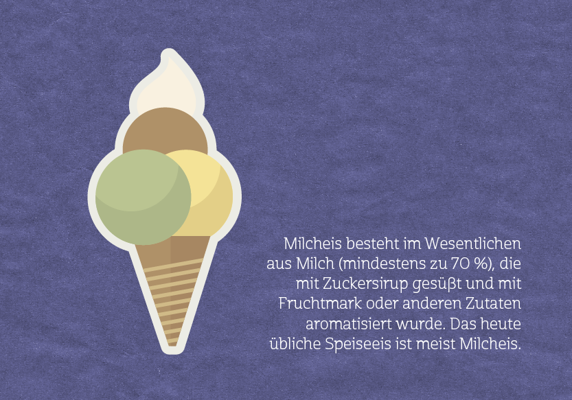verrührt mit Zucker und verschiedenen geschmacksgebenden Zutaten wie Fruchtmus, Vanille, Schokolade und heutzutage häufig Lebensmittelzusatzstoffen, die meist unter Aufschlagen und/oder Rühren zu einer Creme gefroren wird.